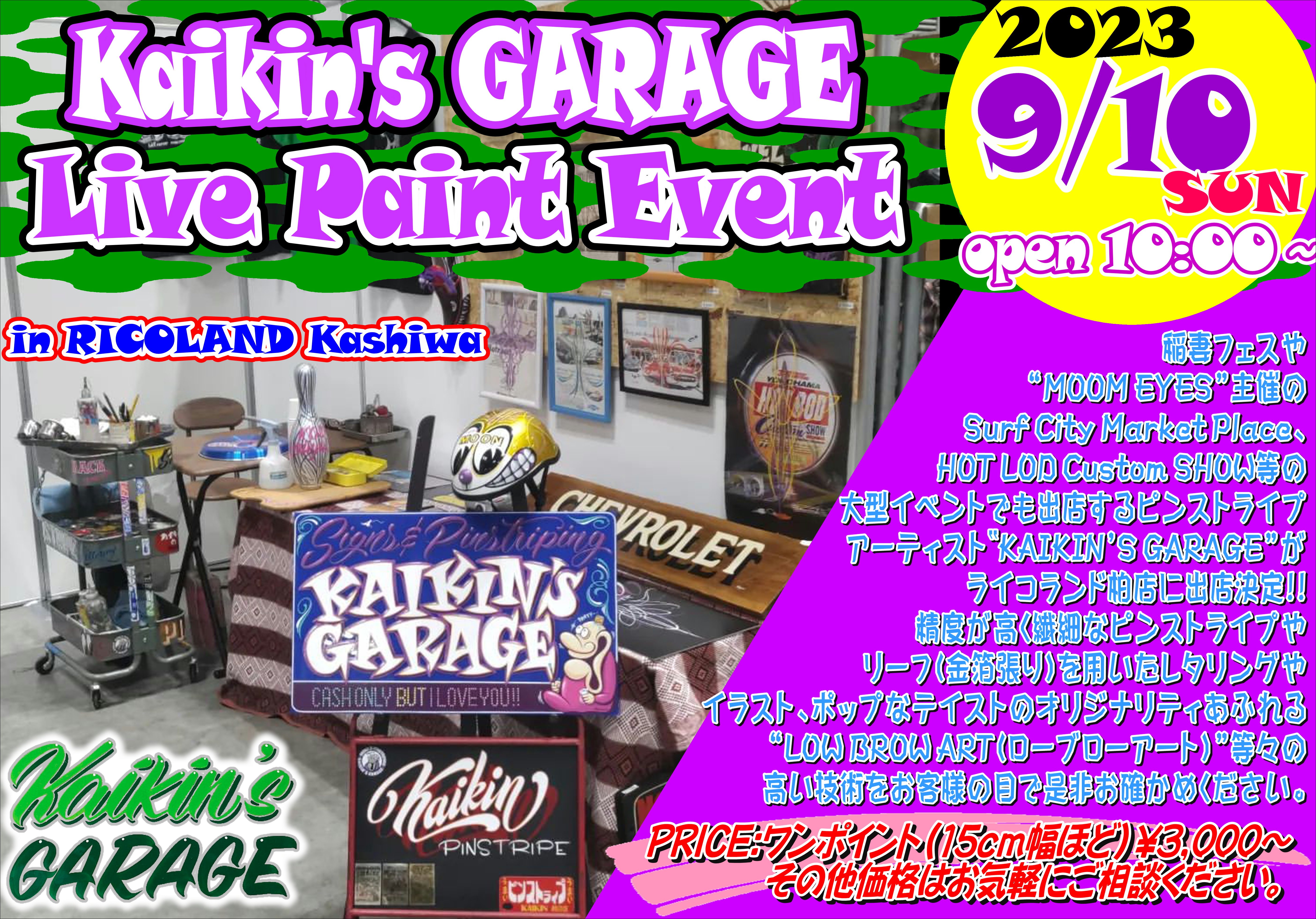 稲妻フェスや"MOOM EYES"主催のSurf City MarketPlace、HOT LOD Custom SHOW等の大型イベントでも出店するピンストライプアーティスト『KAIKIN'S GARAGE』がペイントイベント開催!!