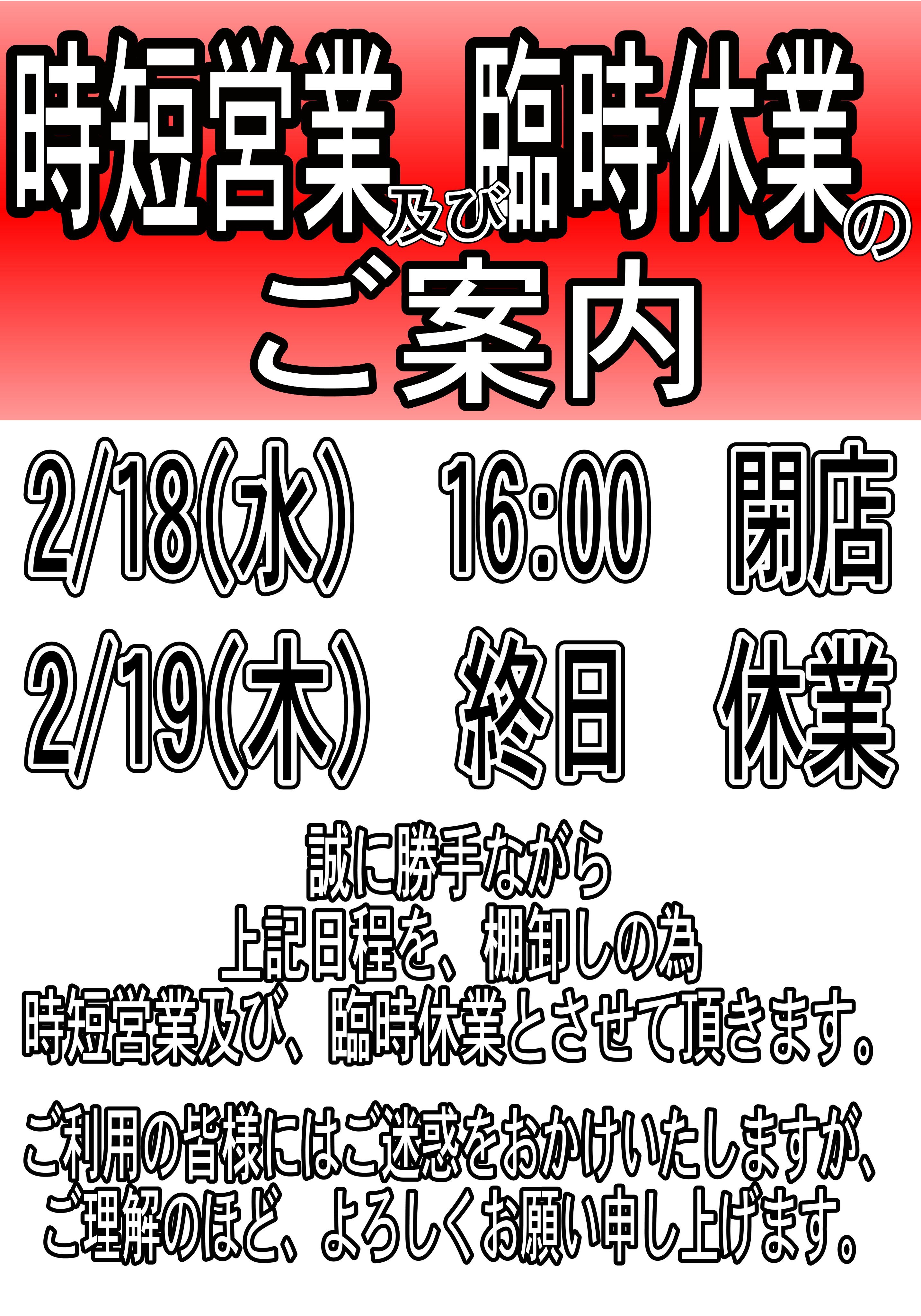 2/18(水)時短営業・2/19(木)終日休業のご案内